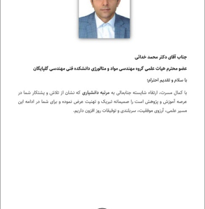 پیام تبریک ارتقا مرتبه علمی دکتر خدایی به دانشیاری