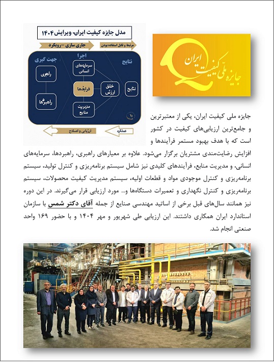 جایزه ملی کیفیت ایران، یکی از معتبرترین و جامعترین ارزیابیهای کیفیت در کشور است که با هدف بهبود مستمر فرآیندها و افزایش رضایتمندی مشتریان برگزار میشود. علاوه بر معیارهای راهبری، راهبردها، سرمایههای انسانی، و مدیریت منابع، فرآیندهای کلیدی نیز شامل سیستم برنامهریزی و کنترل تولید، سیستم برنامهریزی و کنترل موجودی مواد و قطعات اولیه، سیستم مدیریت کیفیت محصولات، سیستم برنامهریزی و کنترل نگهداری و تعمیرات دستگاهها و... مورد ارزیابی قرار میگیرند. در این دوره نیز همانند سالهای قبل برخی از اساتید مهندسی صنایع از جمله آقای دکتر شمس با سازمان استاندارد ایران همکاری داشتند. این ارزیابی طی شهریور و مهر 1404 و با حضور 169 واحد صنعتی انجام شد.