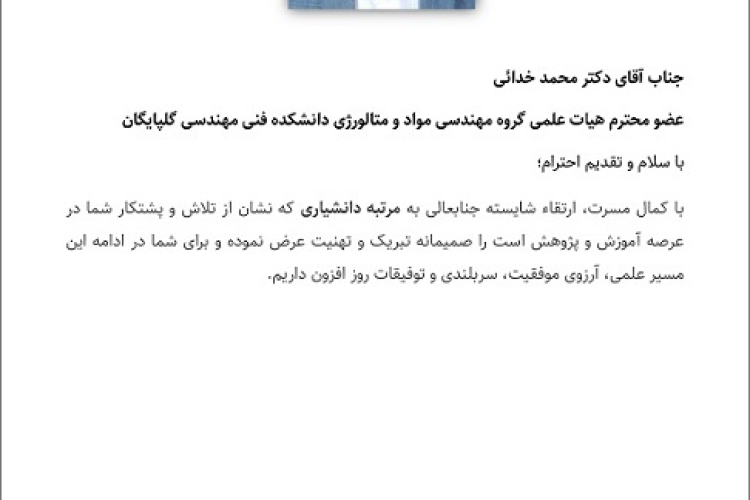 پیام تبریک ارتقا مرتبه علمی دکتر خدایی به دانشیاری